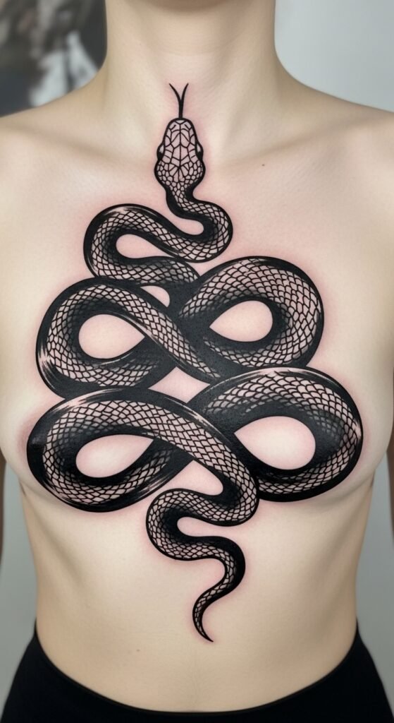 Snakes universally represent transformation, shedding the past, and dangerous allure. Rendering this creature in a heavy, abstract style removes any traditional constraints, making it a favorite for rebellious, artistic women in 2026. It is a visually loud, contemporary design that moves beautifully with the body, constantly shifting and looking alive as the wearer breathes and twists.